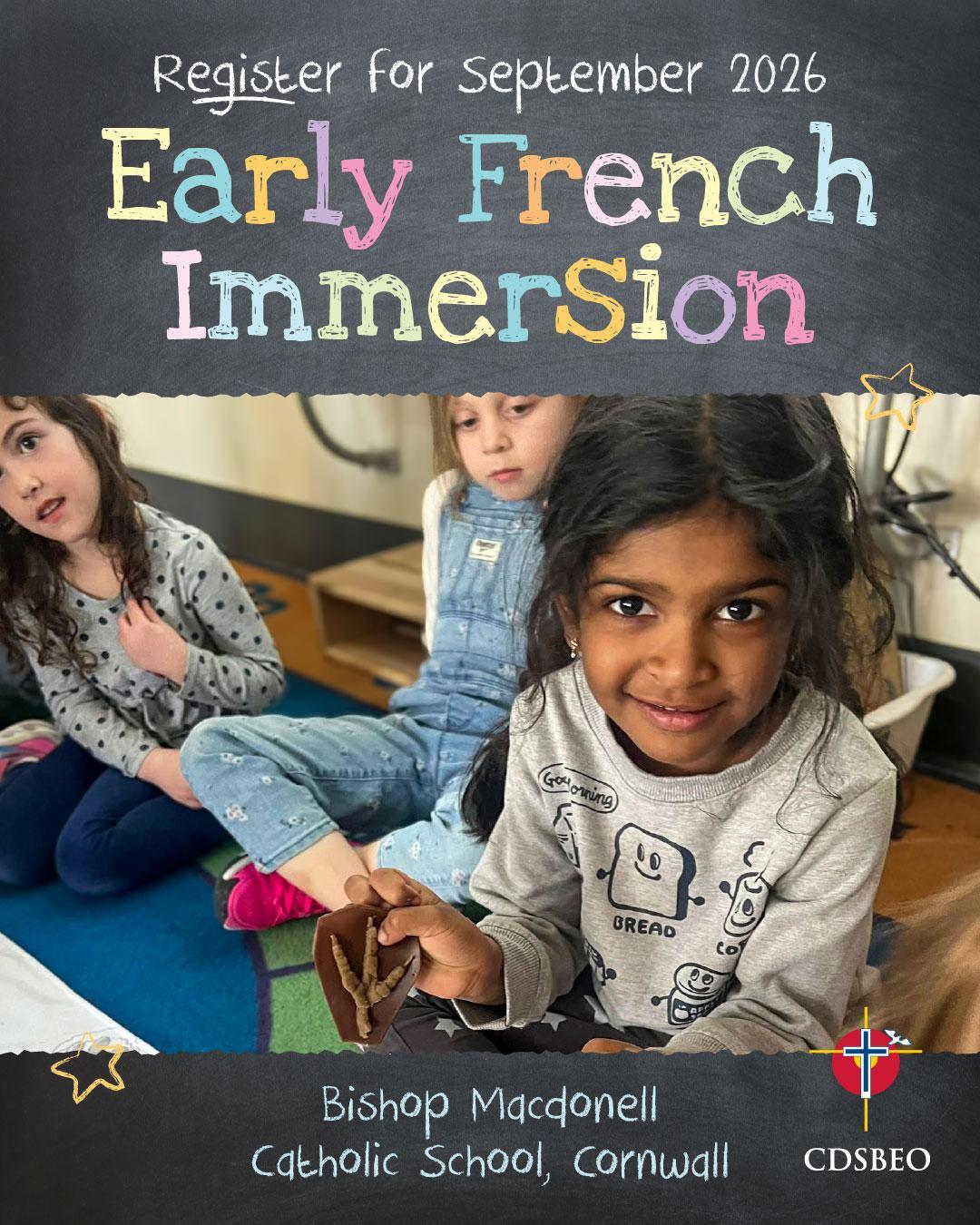 Early French Immersion beginning in JK is available at Bishop Macdonell in Cornwall, and registration for September 2026 is now open! Families can begin the process by completing the online pre-registration form available at http://bit.ly/CDSBEORegistration